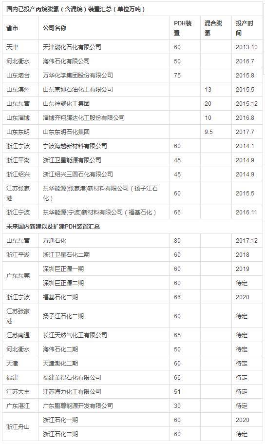 近年來,丙烷脫氫工藝在中國迅速發(fā)展,產(chǎn)能擴張速度驚人,逐漸成為丙烯重要來源之一。自2013年10月,隨著天津渤化60萬噸/年的丙烷脫氫裝置投產(chǎn)運行,丙烷脫氫裝置在國內正式拉開序幕。此后的幾年里,丙烷脫氫裝置在國內遍地開花,迅速發(fā)展,主要集中在華東的江浙地區(qū)、華北地區(qū)以及山東地區(qū),而且近兩三年混合烷烴脫氫這種更加靈活的裝置在山東地區(qū)陸續(xù)投產(chǎn)運行。至今,國內丙烷脫氫(含混烷)制丙烯總產(chǎn)能達到513.5萬噸。但是從下表可以看出,華南地區(qū)尚無丙烷脫氫裝置,深圳巨正源丙烷脫氫裝置建成后,將填補華南地區(qū)丙烷脫氫制高性能聚丙烯及下游加工項目的空缺,給當?shù)鼗て髽I(yè)提供優(yōu)質的化工原料。