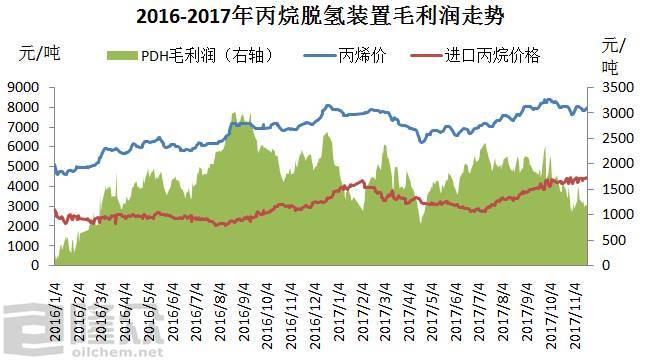 由上圖可見,2016-2017年丙烷脫氫毛利潤表現(xiàn)樂觀,裝置均無虧損情況,尤其在夏季,受原料氣丙烷價格低位,使丙烷脫氫裝置獲利更為理想。華南地區(qū)是國內進口氣集中地,而丙烷脫氫裝置,工藝來源于國外,原料氣丙烷也基本依賴進口,裝置在華南投產(chǎn)建設,原料提供方便。目前,華南地區(qū)的進口丙烷資源多作為工業(yè)氣或者搭配丁烷或者搭配當?shù)責拸S氣今日民用市場,均是作為提供熱值的燃料,據(jù)隆眾數(shù)據(jù)監(jiān)控,2016年華南進口毛利潤在257元/噸左右,2017年至今進口毛利潤在194元/噸左右,相比丙烷脫氫裝置利潤優(yōu)勢十分明顯。