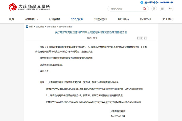 2月8日,大連商品交易所官網發布公告,增加東莞巨正源科技有限公司為聚丙烯期貨交割業務“指定廠庫”。這是繼“巨正源”牌聚丙烯成為期貨注冊品牌、免檢品牌后取得的又一重要成果。